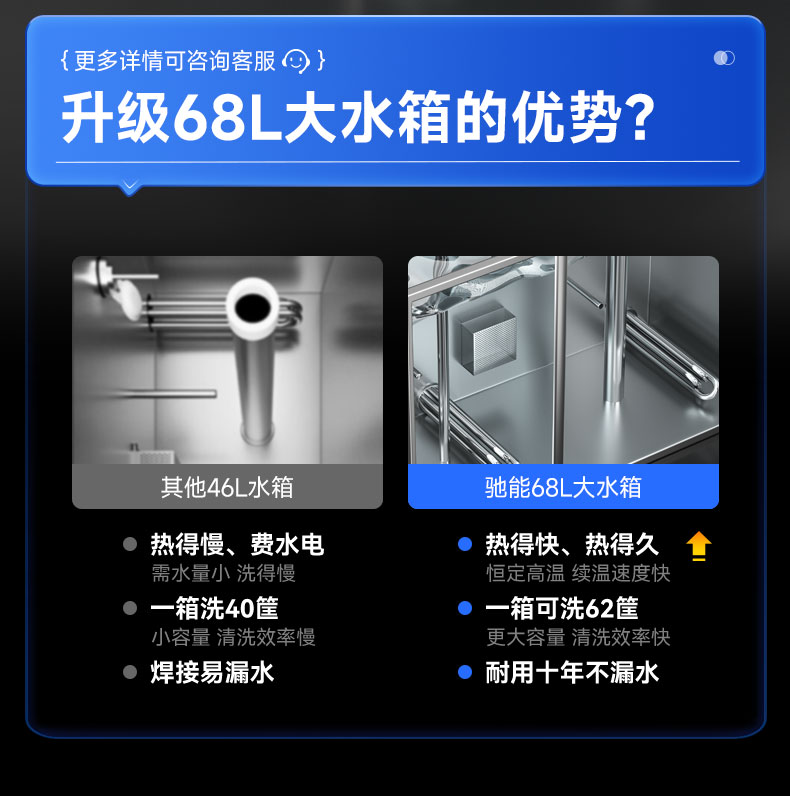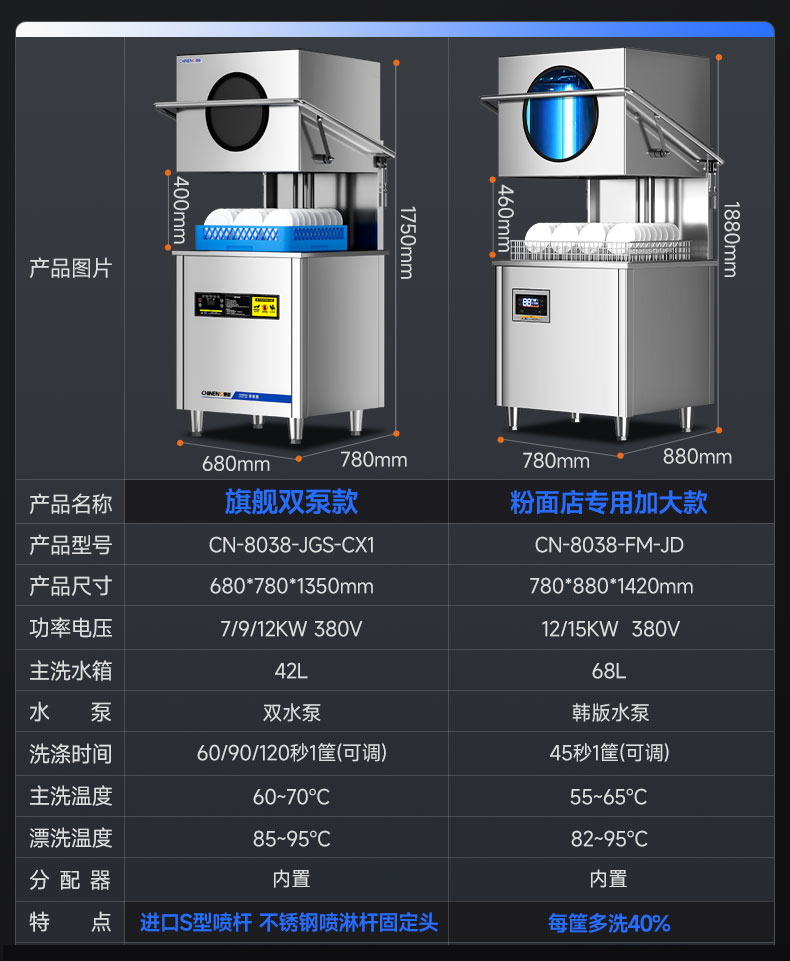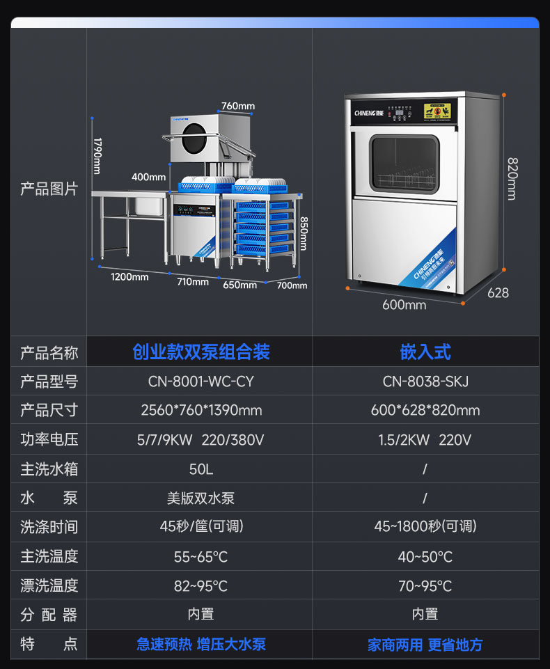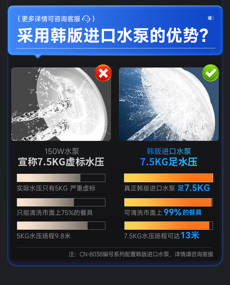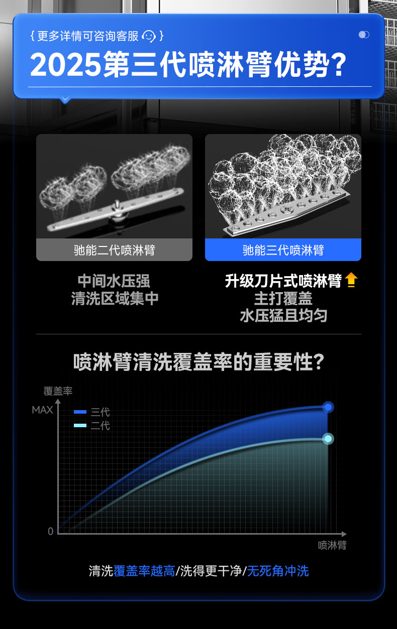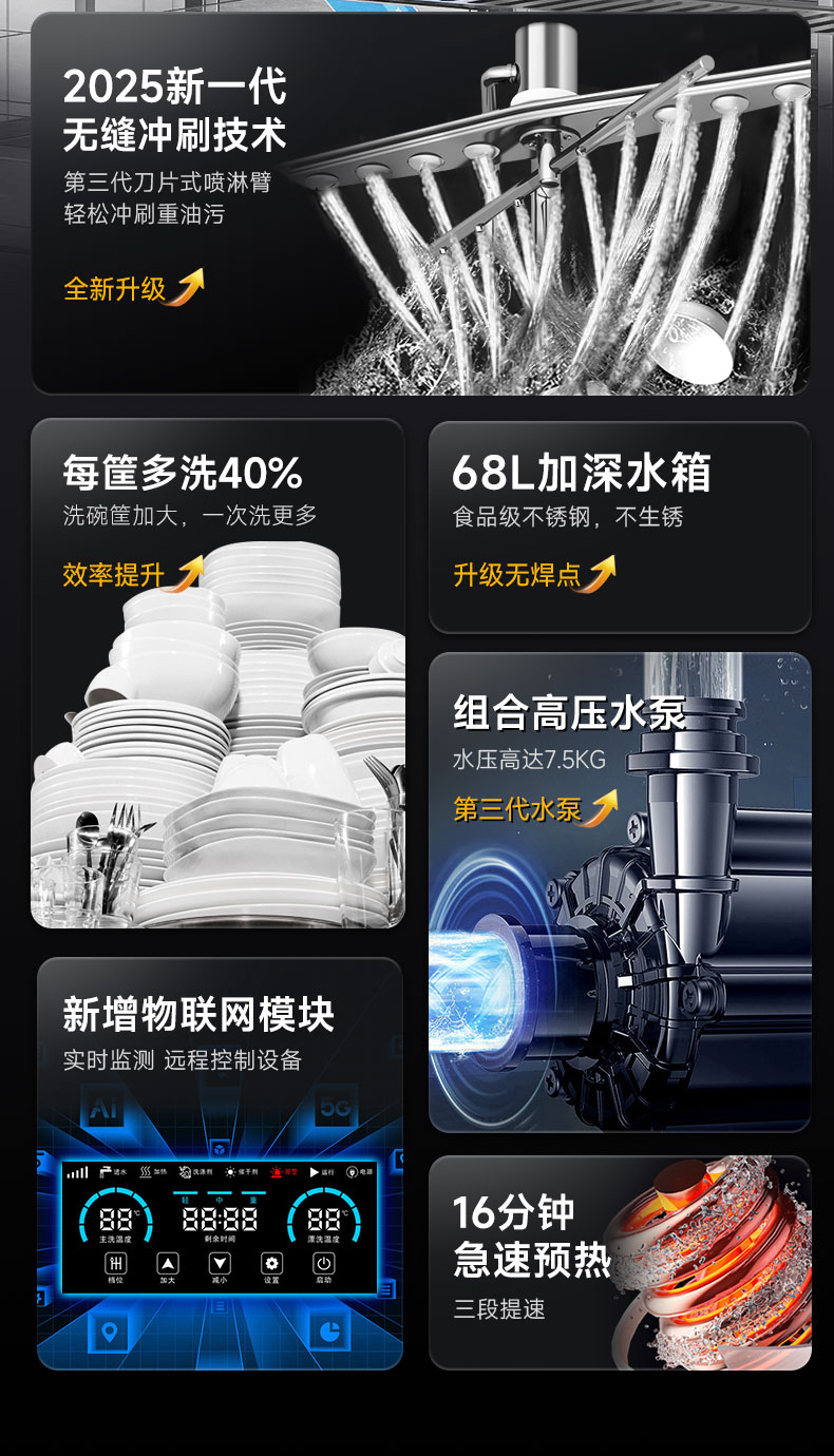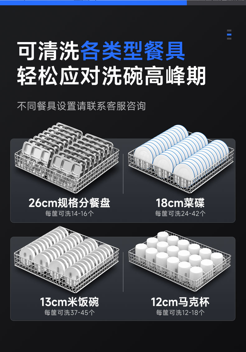 内置高达7.5kg冲洗水压强力水泵,强劲动力喷淋效果好;独特的喷淋臂及内凹防堵塞喷嘴,出水均匀,清洗无死角;45S/60S/90S/120S多档清洗模式,满足不同需要的清洗要求;整体碗筐支架,中心“零”遮挡,清洗更彻底。